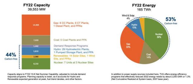TVA 表示其年尖峰負載約 35 GW,近年來,電力需求預測增長服務地區的增長速度,為 了滿足更多電力需求,TVA 預計將投資超過 190 億美元用於擴充發電和輸電系統,目前 TVA 正在興建 3,570 MW 發電容量,另有 1,950 MW 發電容量將進行環境評估。長期以來,核能一 直是 TVA 的電源選項,零碳排電源高達 53%,其中核能已經包括 39%。
