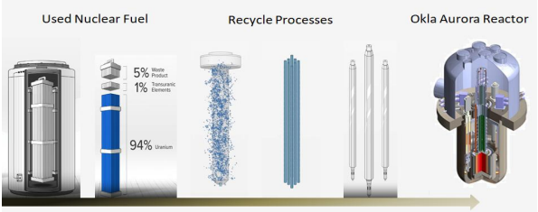 核能發電對人類造成最大的問題是放射性核廢棄料和安全性問題,美國先進核子技術公司奧 克洛公司(Oklo Inc.),在美國能源部的補助下,2025 年 9 月宣布計劃在 Tennessee 州 Oak Ridge 投資 17 億美元,建造一座先進的核燃料回收發電廠,Okla 的核電廠已獲得美國能源部 的建廠許可,Okla 核燃料回收發電廠已取得 Idaho 國家實驗室的核燃料為其核分裂(Fission) 的 燃料來源。因為舊型核電廠的反應器僅利用了燃料中約 5%的能量,Okla 的技術可以將核廢料 轉化為清潔能源,處理核廢料過程可重新利用近 95%的能量,能夠 10 年不需更換燃料,第一 座使用液態金屬快速冷卻 75 MW 電廠將在 2025 年底開始興建,預期 2029 年以前上線運轉。